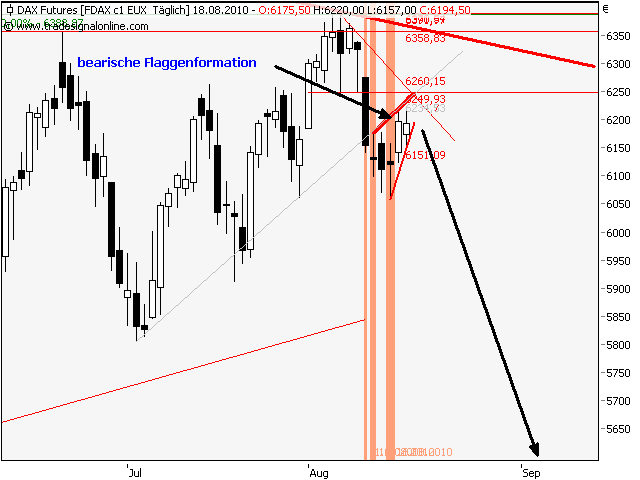 Formation: Konsolidierung als Bärenflagge nach internem kiss back an in innere Trendlinie von Anfang Juli 2010